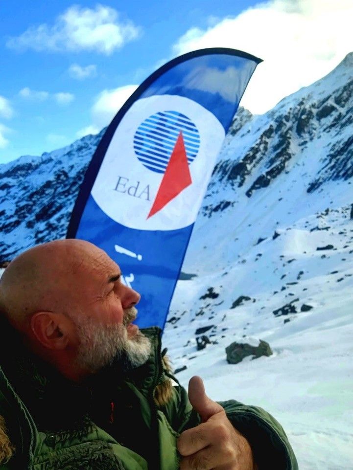 Xavier, second de cuisine en Roumanie, s’est lancé pour défi de porter la flamme de l’EdA au sommet des montagnes enneigées des Carpates.